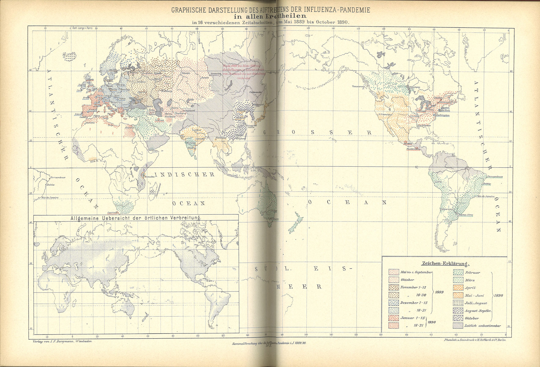 In this map we get a global view, as it was a pandemic that spread across all of the world. We see places where the spread was far more dense than other locations. For example we see that all of Europe had been affected at one point or another. We also see parts of Africa that are bare and most likely not affected or recorded. A major part of this map is to transmit the information and present a timeline of when these different locations got infected over the course of a calendar year. We see places get infected as early as September of 1889 like Tobolsk. We also see places get infected as late as October 1890 such as Korea. We also have locations that are marked as getting infected however it is unknown what month they had been transmitted the disease. Those locations are marked with purple diagonal lines. With viewing this map you truly get to see the scale of how bad and devastating this pandemic became. Although the numbers and dates in this map are estimated due to infections being spread by word of mouth so everything you see on this map may not be 100% accurate, it's the best we are going to get given the time period. We are also given a smaller map in the bottom right corner that shows all the locations infected no matter when they were infected. This does a really good job as the infection spots are all the same color opposed to the colors being associated with different months out of the year. It is a little easier to read. With the key being in the bottom right corner, this map does a fantastic job of showing why this was truly a global pandemic and how it ended up retaining that title so quickly due to the fast spread of the disease.
