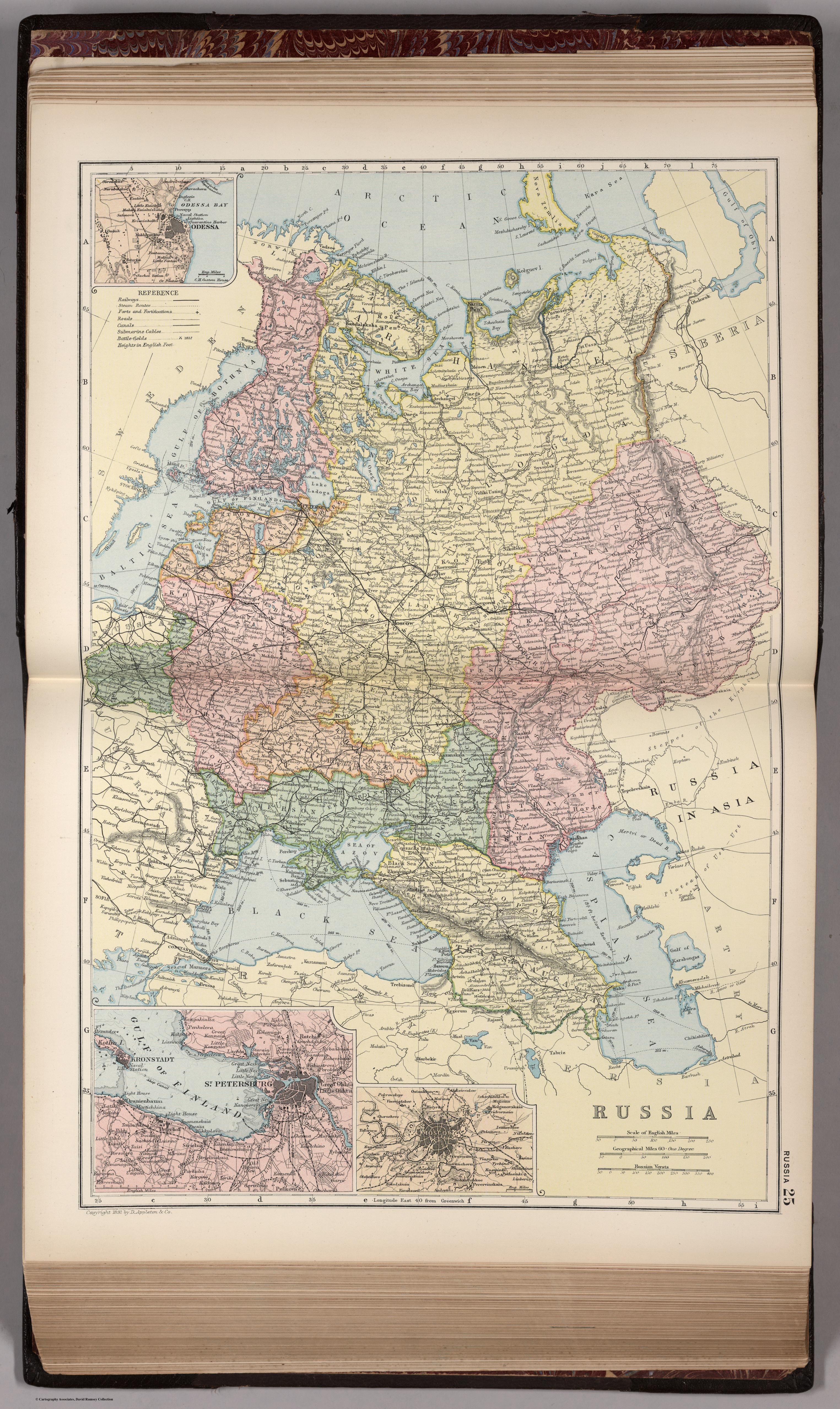 It is largely a political map, with provinces differentiated by color and cities and larger towns are notated. Although largely in English, the scale is given in versts as well as miles.