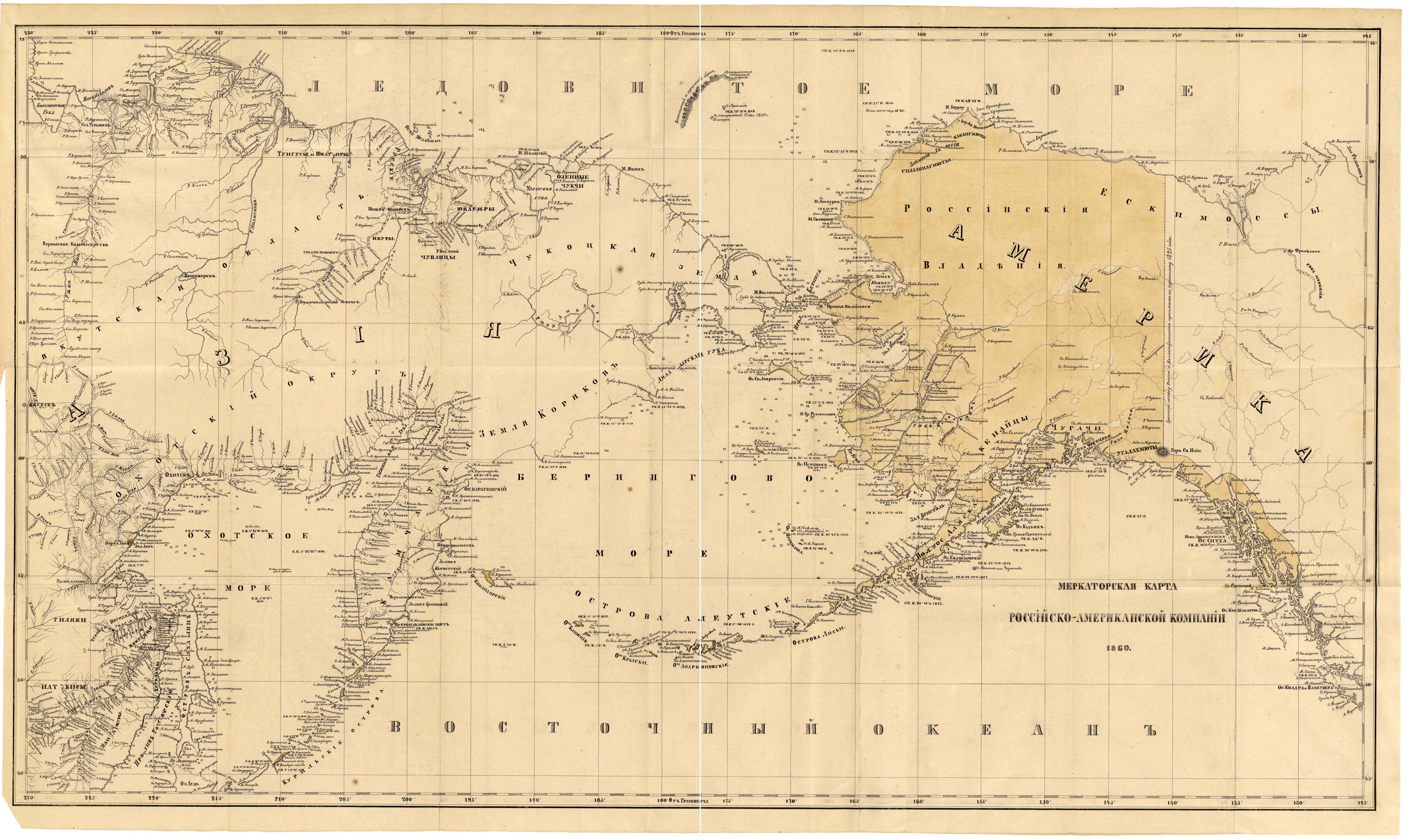 This map from just before the sale of Alaska by the Russian Empire to the United States of America gives a clear image of the North American territory held by Russia. The fact that this map was created by the Russian-American Company indicates the importance maritime trade and commerce played in the mapping of this region, as well as the considerable effort made to create far more detailed maps of the coastal areas, though the interior and northern regions remain largely uncharted.